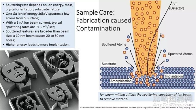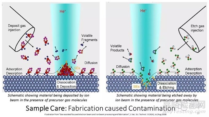 毋庸置疑,首先,這些污染大部分來(lái)自于帶電粒子束和樣品的對(duì)撞Particle Solid Interaction,污染來(lái)源分為大致來(lái)自三個(gè)方面:第一方面,是帶電粒子束對(duì)樣品的注入Implatation,所帶來(lái)的對(duì)樣品的污染,排除對(duì)樣品去除和改性的影響,這個(gè)污染的等級(jí)最??;