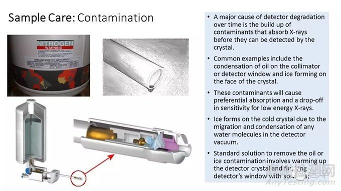 針對(duì)能譜探頭窗口的油污染,我們可以在室溫下使用無(wú)水乙醇Ethanal清潔窗口來(lái)去除;針對(duì)附著于晶體上的冰污染,我們需要將探頭晶體加熱,并及時(shí)更換微漏的窗口來(lái)解決;因?yàn)橹挥性诖翱谖⒙┑臓顟B(tài)下,水蒸汽才有可能穿透超薄窗凝結(jié)在探頭的晶體之上;