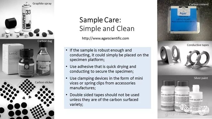 這里還有最重要的一項(xiàng)防污染的建議,就是:不建議用戶(hù)使用碳基膠帶Carbon Based Tape、或碳膠Carbon adhensive來(lái)固定樣品;碳污染是電鏡最大的敵人,在不得不用的情況下,也要盡量少用;建議可以盡量使用銅導(dǎo)電膠帶Copper Tape,在不防礙成分分析前提下,可以使用銀膠Silver adhensive;