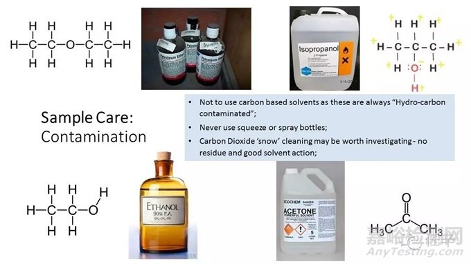 同理,清洗樣品時(shí),也要盡量不去使用碳基的溶劑比如乙醇,而使用去離子水Deionilized water;不得不用的情況下,可以先使用碳基溶劑,再用去離子水將樣品清洗干凈、并用氮?dú)獯蹈伞?/span>