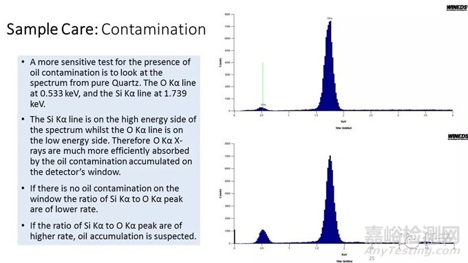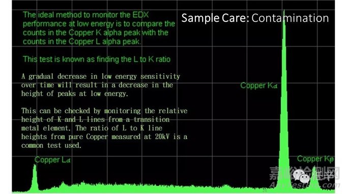 如果窗口有油污染,必然會(huì)導(dǎo)致銅或鎳的La譜線計(jì)數(shù)偏少,也就是K對(duì)L比值,要比正常的沒(méi)有污染的比值要高,這個(gè)比值越高,就表示窗口的油污染越嚴(yán)重;
