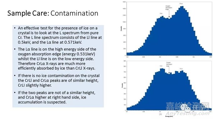 也同理,對(duì)于能譜晶體的冰污染,我們可以利用純鉻樣品Cr,觀察處在鉻譜峰的低能量部的LI的0.5KeV的譜線中間峰,和La0.571KeV的譜線中間峰;正常的沒(méi)有被冰污染的能譜晶體,會(huì)觀測(cè)到鉻的La譜線高度,相對(duì)于鉻LI譜峰,會(huì)處在大致一樣的高度;氧的Ka譜峰中間峰能量在0.531KeV,如果能譜探頭的晶體受到了冰的污染,必然會(huì)導(dǎo)致鉻的La譜線計(jì)數(shù),相對(duì)于鉻LI譜峰要高;鉻La譜峰比LI譜峰高得越多,就表明晶體所受到的冰污染越嚴(yán)重;