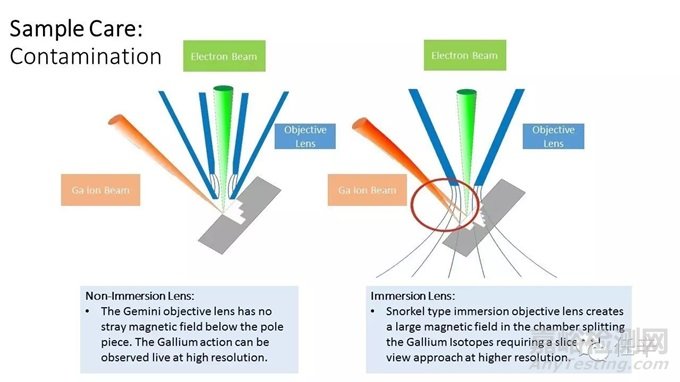這里稍加一段:嚴(yán)格來(lái)講,攜帶磁性的樣品,和采用浸沒(méi)式電磁物鏡的外溢磁場(chǎng),各自相對(duì)于對(duì)方都是一類(lèi)污染源;在這個(gè)話(huà)題上,非浸沒(méi)式物鏡是更為合理的選擇;