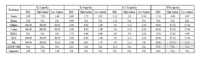 表1.從不同平臺(tái)比較PBMC中提取4種細(xì)胞因子水平(包含spike高濃度和低濃度樣品及內(nèi)源性質(zhì)控樣品(EQC,Endogenous quality control))[5]