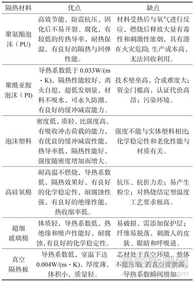 表1 傳統(tǒng)動力電池隔熱材料的優(yōu)缺點