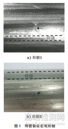 近幾年,常有一些焊管客戶反饋不銹鋼焊管在密封性測(cè)試后出現(xiàn)裂紋,與常見(jiàn)的焊管裂紋不同的是,常見(jiàn)焊管裂紋通常發(fā)生在焊縫位置,而該類裂紋不是發(fā)生在焊縫處,而是發(fā)生于焊管的母材位置,且為垂直于焊縫的橫向裂紋,裂紋較短,長(zhǎng)度通常小于3mm,有時(shí)小如針尖狀(見(jiàn)圖1)。該類裂紋在304、316L、321等奧氏體不銹鋼中均被發(fā)現(xiàn)過(guò),已發(fā)現(xiàn)缺陷的母材試樣均為厚度小于1.0mm的薄板。