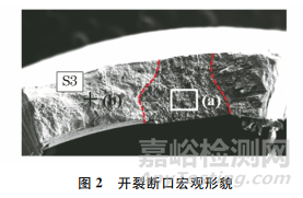 開(kāi)裂斷口宏觀形貌如圖2所示,中間為開(kāi)裂區(qū)域,左側(cè)為裂紋兩邊人為掰斷的區(qū)域。