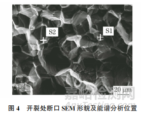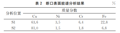 將裂紋斷口試樣進(jìn)行機(jī)械切割、超聲清洗、乙醇清洗、烘干,再置于SEM下觀察,并對(duì)其進(jìn)行能譜分析,結(jié)果如圖4及表2所示。
