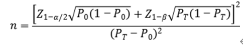 公式中,n為樣本量;Z1-α/2、Z1-β為顯著性水平和把握度的標(biāo)準(zhǔn)正態(tài)分布的分?jǐn)?shù)位,P0為評(píng)價(jià)指標(biāo)的臨床可接受標(biāo)準(zhǔn),PT為試驗(yàn)體外診斷試劑評(píng)價(jià)指標(biāo)預(yù)期值。