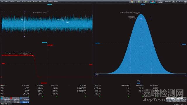 圖1:左上圖是帶寬受限的高斯噪聲的時(shí)域圖,左下圖是功率譜密度,是帶寬受限噪聲的頻域圖;右面的柱狀圖是帶寬受限噪聲的統(tǒng)計(jì)圖。這三個(gè)視圖都因采用了有助于對(duì)測(cè)量進(jìn)行量化的測(cè)量參數(shù)而得到增強(qiáng)。