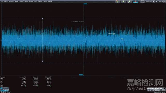 測(cè)量參數(shù)可以應(yīng)用于圖2中的噪聲波形,以深入了解這種噪聲信號(hào)的特性。圖中顯示的參數(shù)有平均值、標(biāo)準(zhǔn)偏差和峰峰值。顯示器下方顯示了讀取的參數(shù)值。