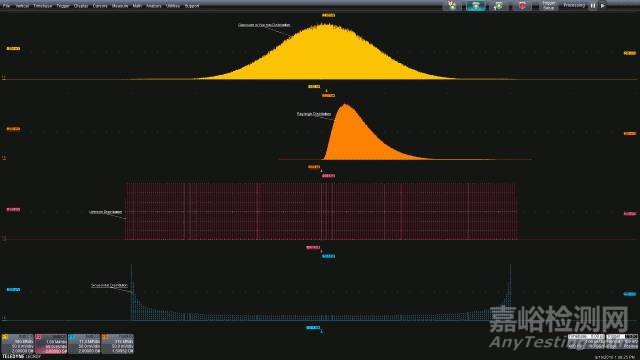在許多應(yīng)用中,兩個(gè)或多個(gè)隨機(jī)過程可能發(fā)生交互。當(dāng)這種情況發(fā)生時(shí),過程的概率密度會(huì)進(jìn)行數(shù)學(xué)卷積運(yùn)算。一個(gè)常見的例子是結(jié)合了隨機(jī)和確定性抖動(dòng)分量的時(shí)序抖動(dòng)。圖5顯示了結(jié)合在一起的高斯和正弦分量,源分布位于上面兩張圖,從上往下數(shù)的第三張分布圖是兩個(gè)源卷積的結(jié)果。許多先進(jìn)的示波器提供可選的抖動(dòng)或噪聲分析包,這些分析包可以將這些組合式分布分開,單獨(dú)測(cè)量分量。