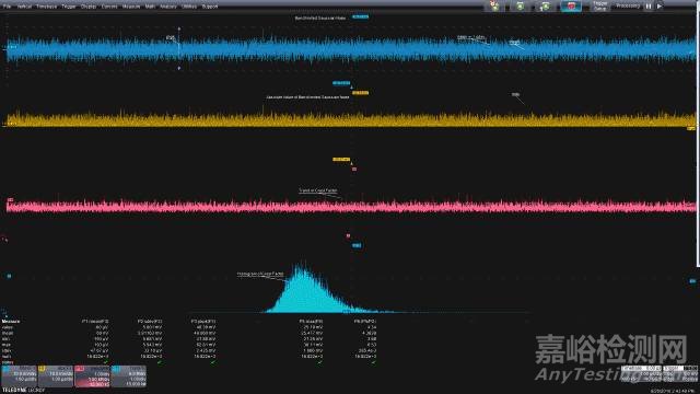 測(cè)量參數(shù)也可以應(yīng)用于柱狀圖。在這個(gè)例子中是柱狀圖均值(hmean)、標(biāo)準(zhǔn)偏差(hstdev)和范圍(hrange)。注意,這些讀數(shù)與前面測(cè)量時(shí)間波形得到的均值、標(biāo)準(zhǔn)偏差和峰峰值非常接近,兩者之間很小的差別是對(duì)柱狀圖樣本的“分割”造成的。