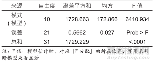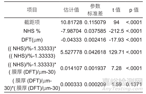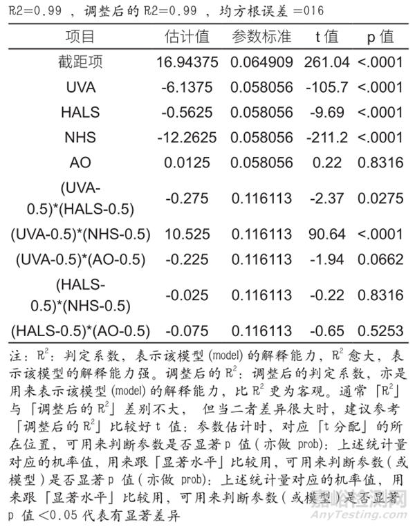 于水性罩光清漆對(duì)珠光涂層耐候和耐熱保護(hù)的影響。實(shí)驗(yàn)計(jì)劃如表2所示,從表2的實(shí)驗(yàn)數(shù)據(jù)分析結(jié)果如表3參數(shù)估計(jì)表和表 4 變異數(shù)分析(ANOVA)表如下所示: