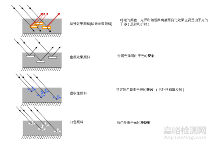 圖1 涂料系統(tǒng)中可見(jiàn)光與不同類型顏料中粒徑光學(xué)相互作用的應(yīng)用效果