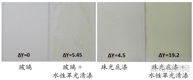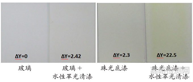 (1) 將水性罩光清漆噴涂于玻璃和珠光底漆上經(jīng)耐候313 nm 300h測(cè)試結(jié)果顯示,噴涂于玻璃上水性罩光清漆黃變值ΔY=5.45,而同樣水性罩光清漆噴涂于珠光底漆上,黃變值大幅上升至14.7 (ΔY=19.2-4.5),顯示珠光底漆對(duì)于水性罩光清漆可能因紫外光反射,折射和干涉下造成嚴(yán)重破壞。