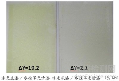 圖7為罩光清漆于珠光漆涂裝耐候照片,可以觀察到,經(jīng)100°C烘烤5h后,空白組已嚴(yán)重變色,添加1% NHS可以顯著有效提升罩光清漆對(duì)珠光漆耐候。
