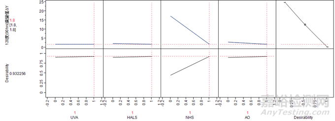 主效應(yīng)分析如圖6所示,橫坐標(biāo)分別為光穩(wěn)定劑(UVA) (%),光穩(wěn)定劑(HALS) (%),新型耐UV/耐熱劑(NHS) (%)和抗氧化劑(AO) (%),表示添加0~1%的劑量于罩光清漆,縱軸表示120°C90h,黃變值(ΔY)變化值,值越小,代表罩光清漆對(duì)珠光漆耐熱保護(hù)效果佳,值愈大,代表耐熱保護(hù)效果差,而由圖型斜率可以看到新型耐UV/耐熱劑(NHS)最大,代表改善效果好,其它斜率較平緩,改善效果不明顯。