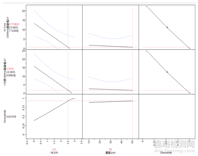 主效應(yīng)分析如圖8所示,橫坐標(biāo)分別為新型耐UV/耐熱劑(NHS) (%) 和膜厚DFT(μm),E NHS (%) 表示添加0~3%的劑量于水性丙烯酸涂料,膜厚表示水性丙烯酸涂料的膜厚10 ~50μm,縱軸表示313nm耐候300 h黃變值(ΔY)變化值,值越小,代表水性罩光清漆于珠光漆提升耐候效果佳,值愈大,代表耐候改善效果差。
