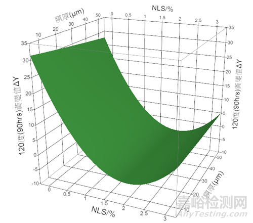 2.3.3 反應(yīng)曲面(Response Surface Methodology) (RSM)探討新型耐UV/耐熱劑(NHS)與膜厚耐候影響分析