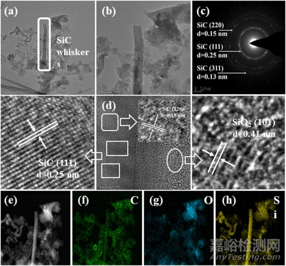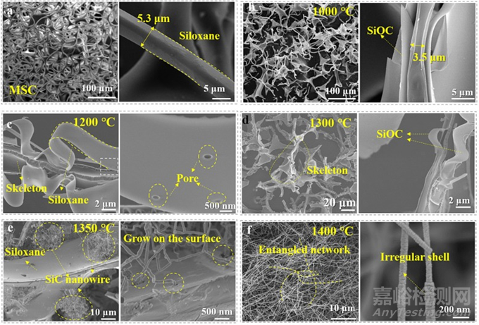 通過(guò)分析不同燒結(jié)溫度下產(chǎn)物的形貌和結(jié)構(gòu)演變,探討相關(guān)機(jī)理。圖1a顯示,MSC由直徑為~5.3μm的三聚氰胺海綿骨架組成的多孔結(jié)構(gòu),涂上一層硅氧烷干凝膠層。在1000°C下,骨架收縮到3.5μm,并且硅氧烷仍然分布在骨架表面(圖1b)。表明1000°C下,主要是骨架的碳化和收縮,沒(méi)有碳熱還原反應(yīng)。在1200°C下燒結(jié)后,在骨架表面觀察到孔隙,這與硅氧烷分解形成的氣體有關(guān)(圖1c)。對(duì)于SSAs-1300,發(fā)現(xiàn)了骨架結(jié)構(gòu),未觀察到SiC納米線(圖1d)。在1350°C下,SiC納米線簇分布在骨架上,但仍有大量骨架未被反應(yīng)(圖1e)。此外,可以觀察到交錯(cuò)的納米線的根附著在骨架的表面,表明SiC納米線可以從骨架的表面成核并生長(zhǎng)。說(shuō)明在1350°C下,SiC納米線可以在硅氧烷表面成核,但生長(zhǎng)緩慢。高達(dá)1400°C時(shí),SiC納米線相互纏繞形成網(wǎng)絡(luò),表明SiC納米線的生長(zhǎng)和組裝可以在1400°C下完成(圖1f)。