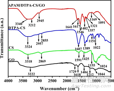 圖3. GO、CS、DTPA-CS和APAM/DTPA-CS/GO復(fù)合氣凝膠的FT-IR吸收光譜