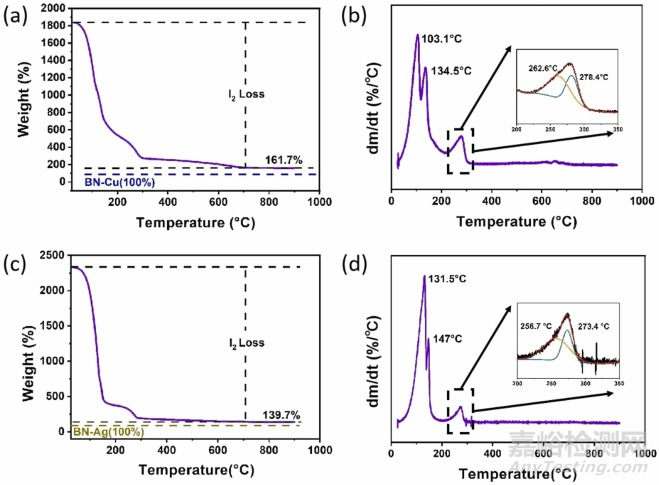 對(duì)BN-Cu@I2和BN-Ag@I2進(jìn)行熱重分析,以進(jìn)一步了解氣凝膠對(duì)碘的吸附機(jī)理。在N2氛圍下,速率為5°C/min,將氣凝膠加熱至900°C。圖6a顯示,測(cè)試后最終殘留質(zhì)量是原始BN-Cu氣凝膠的1.617倍,Cu與碘的摩爾比估計(jì)為~1:1.73,表明解吸后氣凝膠中仍有一些碘。TG曲線的一階微分得到DTG曲線(圖6b),表明碘解吸過(guò)程在103.1°C,134.5°C,262.6°C和278.4°C分四個(gè)步驟發(fā)生。對(duì)BN-Ag@I2,最終殘余質(zhì)量為BN-Ag初始質(zhì)量的1.397倍(圖6c)。DTG曲線顯示,解吸過(guò)程在131.5°C,147°C,256.7°C和273.4°C分為四個(gè)步驟(圖6d)。