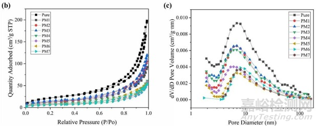 如圖5b所示,純氣凝膠具有較高的N2吸附能力。需要注意的是,N2吸附-脫附對(duì)大于100nm的孔徑不敏感。添加OMMT后,產(chǎn)生的微米級(jí)孔徑超出了BET測(cè)試范圍。因此,N2吸附能力會(huì)降低。等溫線是典型的IV型,沒(méi)有微孔跡象,明顯高于P/P0=0.8-0.9,表明存在中孔和大孔。該材料主要是介孔材料,平均孔徑為10-17 nm(介孔范圍為2-50 nm)。由于純氣凝膠的孔隙較多,其比表面積最高。如圖5c所示,氣凝膠的孔徑分布在10nm-140nm之間。