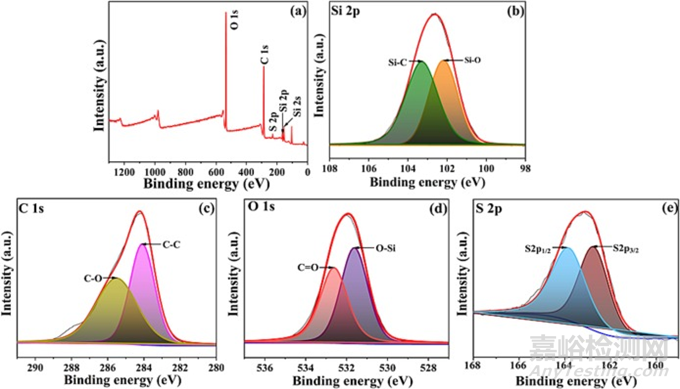 XPS研究用于分析TGM基和原始TEOS基SiO2氣凝膠的元素組成、化學(xué)狀態(tài)和功能。圖7a顯示,由于TGM基氣凝膠中的環(huán)氧硫醇聚合,TGM基SiO2氣凝膠中除了Si、O、C元素外,還存在S元素。Si 2p光譜(圖7b)在102.8eV和103.1eV處有兩個(gè)峰,分別歸屬于Si-C和Si-O,表明即使使用環(huán)氧基和硫醇基連接的二氧化硅共前體,也會(huì)形成SiO2氣凝膠。對(duì)于284.6eV處的不定碳,C1s在284.5eV、285.9eV和288.2eV的峰分別對(duì)應(yīng)于C-C、C-O和C=O(圖7c)。圖3d 中O1s光譜位于532.2eV和533.1eV的兩個(gè)峰,分別與O-Si和C-O有關(guān)。此外,S 2p光譜(圖7e)證明了S 2p1/2和S 2p3/2鍵分別位于163.3eV和164.5eV的B.E.位置,證實(shí)了由于環(huán)氧硫醇聚合而形成的C-S-C結(jié)合網(wǎng)絡(luò)。