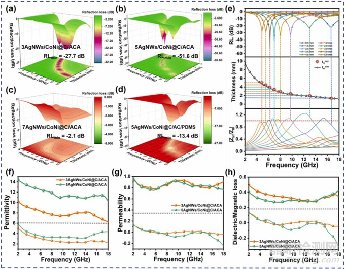 圖8. 三維RL-f曲線(a-d);5AgNWs/CoNi@C/ACA的2D RL-f曲線,λ/4對(duì)RL峰值頻率的相關(guān)性,以及|Zin/Z0|-f曲線(e);3AgNWs/CoNi@C/ACA和5AgNWs/CoNi@C/ACA的復(fù)介電常數(shù)(f), 復(fù)磁導(dǎo)率(g), 介電和磁損耗(h)