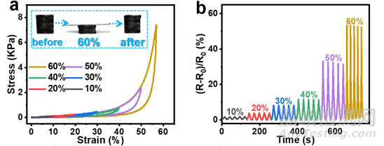 圖9. MFC氣凝膠的壓縮應(yīng)力-應(yīng)變曲線和在循環(huán)壓縮應(yīng)變下的電阻變化