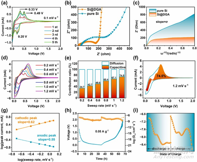 圖10. 掃描速率0.1mV·s-1下Si@DGA的CV曲線(a); Si@DGA的奈奎斯特圖以及和電池循環(huán)后的Si (b); Si@DGA和Si的Warburg擬合曲線(c); 不同掃描速率下Si@DGA的CV曲線(d); 不同掃描速率下的偽電容貢獻(xiàn)率(e); 1.2mV·s-1下電容貢獻(xiàn)(f); 峰值電流與掃頻平方根的關(guān)系(g); 在0.05A·g-1下Si@DGA的GITT曲線和相應(yīng)log(DLi+)(h); Si@DGA放電狀態(tài)和充電狀態(tài)下的放大log(DLi+)曲線(i)