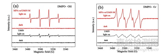 為了評(píng)估丙酮光降解中主要氧化物種的貢獻(xiàn),進(jìn)行了ESR測(cè)量。用自旋捕獲試劑DMPO分別在黑暗和可見(jiàn)光下研究了水溶液和甲醇懸浮液中的活性氧(自由基·OH和·O2-)。如圖所示,在黑暗環(huán)境中未檢測(cè)到·OH和·O2-的相應(yīng)信號(hào)。當(dāng)暴露在可見(jiàn)光下10min時(shí),U66N及氣凝膠復(fù)合材料出現(xiàn)了不同強(qiáng)度的·OH和O2-的特征峰。對(duì)于純MOF,自由基·OH和O2-的弱信號(hào)表明電荷載流子快速?gòu)?fù)合。然而,MPA-m/U66N-m的自由基·OH和O2-信號(hào)強(qiáng)度表現(xiàn)出比U66N高5.0倍和6.7倍,這與氣凝膠復(fù)合材料中的高導(dǎo)電性MPA-m密切相關(guān)。因此,自由基·OH和·O2-的高生成效率顯著提高了MPA-m/U66N-m對(duì)丙酮降解及其深度礦化的光催化活性。