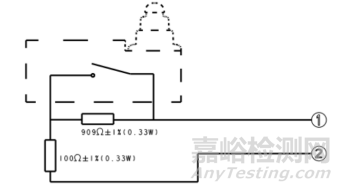 在氣候環(huán)境試驗負(fù)荷下,也需要同時對開關(guān)的功能進(jìn)行監(jiān)控。座椅靠背微動開關(guān),通過開關(guān)阻值的變化信號來表征靠背上鎖/解鎖狀態(tài)和座椅角度。開關(guān)在額定工作電壓8VDC下工作,當(dāng)開關(guān)處于解鎖狀態(tài)時,內(nèi)部電阻是909Ω,當(dāng)開關(guān)處于上鎖狀態(tài)時,內(nèi)部電阻是100Ω。樣品的內(nèi)部簡圖如圖2所示。因此,在試驗中對樣品功能的監(jiān)控本質(zhì)上就是對電阻變化值的監(jiān)控。但是,在環(huán)境試驗箱、鹽霧試驗箱內(nèi),我們很難通過操作孔去人為不斷地檢查樣品的內(nèi)部電阻變化情況。所以,可以考慮采用伏安法對其進(jìn)行監(jiān)控。如圖3、圖4所示,在開關(guān)回路中串聯(lián)介入一個1Ω的電阻,試驗中監(jiān)控該1Ω的電阻兩端電壓。在理論情況下,監(jiān)控的電壓數(shù)值即為回路電流數(shù)值,再根據(jù)歐姆定律可以將電流數(shù)值結(jié)合工作電壓轉(zhuǎn)換為電阻。最終將監(jiān)控所得到的電阻值,判斷座椅靠背微動開關(guān)的內(nèi)部電阻功能是否正常。