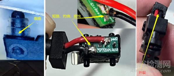 根據(jù)開關(guān)的按鈕下方的金屬部件出現(xiàn)腐蝕并伴有鹽份的現(xiàn)象,結(jié)合樣品的設(shè)計、工藝、結(jié)構(gòu),我們進(jìn)一步查找失效的原因。將失效的開關(guān)放在顯微鏡下,發(fā)現(xiàn)按壓觸電的硅膠帽呈現(xiàn)有破裂折痕、電線和密封膠之間出現(xiàn)裂痕、負(fù)極與電路板上的引腳之間出現(xiàn)短路現(xiàn)象(電線受到擠壓導(dǎo)致在低壓注塑的過程中出現(xiàn)翹曲并與電路板上的多余引腳出現(xiàn)摩擦),如圖7所示。取出其他分組的開關(guān)進(jìn)行對比,一組是只進(jìn)行過三溫度三電壓檢測的樣品,另一組是進(jìn)行過三溫度三電壓檢測和高低溫存儲的樣品。通過對比發(fā)現(xiàn),只進(jìn)行過三溫度三電壓檢測的樣品,雖然功能正常,但是電線和密封膠之間出現(xiàn)輕微裂痕;進(jìn)行過三溫度三電壓檢測和高低溫存儲的樣品,電線和密封膠之間出現(xiàn)明顯裂痕且密封膠出現(xiàn)破裂。此外,開關(guān)是低壓注塑工藝包裹其電路板,包裹的材料為二甲基硅橡膠橡膠,從而達(dá)到密封的功能。但是二甲基硅橡膠橡膠的缺點是強度低,在低溫條件下抗撕裂性能差,耐磨性能也差。綜上所述,結(jié)合開關(guān)內(nèi)部的金屬件出現(xiàn)腐蝕現(xiàn)象,可推理得出鹽霧試驗失效的原因是前面的三溫度三電壓檢測和高低溫存儲試驗導(dǎo)致橡膠老化開裂。所以在鹽霧實驗中,水分沿著黑色電線往開關(guān)內(nèi)部流動。由于電線表皮有損傷,且離外部近,水分的進(jìn)入,導(dǎo)致腐蝕和短路現(xiàn)象的出現(xiàn)。