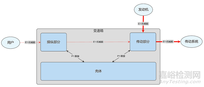 接下來(lái)我們來(lái)看看變速箱由幾個(gè)部分組成,以及這些組成部分的關(guān)系以及組成部分與非變速箱系統(tǒng)之間的關(guān)系。細(xì)心的讀者會(huì)發(fā)現(xiàn)發(fā)動(dòng)機(jī),用戶以及傳動(dòng)系統(tǒng)的連線已經(jīng)下沉到組成變速箱的組成部分中去了,分別是:操縱部分,傳動(dòng)部分以及殼體。為什么?變速箱在實(shí)際工作的時(shí)候,超系統(tǒng)組件(發(fā)動(dòng)機(jī),用戶以及傳動(dòng)系統(tǒng))是與操縱部分和傳動(dòng)部分關(guān)聯(lián)的,當(dāng)然,也可以說(shuō)是與變速箱關(guān)聯(lián)的,但是現(xiàn)在,我們已經(jīng)掌握了更多的信息:也確實(shí)知道用戶將會(huì)撥動(dòng)操縱部分以實(shí)現(xiàn)換檔的功能,我們也可以說(shuō)用戶與變速箱互動(dòng),根據(jù)實(shí)際路況來(lái)控制檔位。一個(gè)原則:隨著掌握變速箱的程度越來(lái)越高,連線需要逐步下沉,只在最底層(沒(méi)有葉節(jié)點(diǎn))進(jìn)行接口聯(lián)接的動(dòng)作。