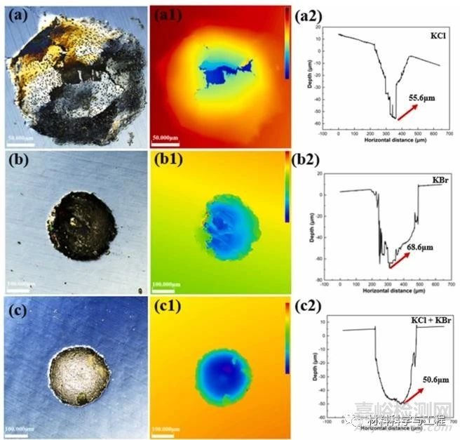 圖 1.(a)氯化鉀溶液中腐蝕試樣動(dòng)態(tài)電位試驗(yàn)后的點(diǎn)蝕形貌及其尺寸;(b) KBr溶液;(c) KCl + KBr混合溶液。