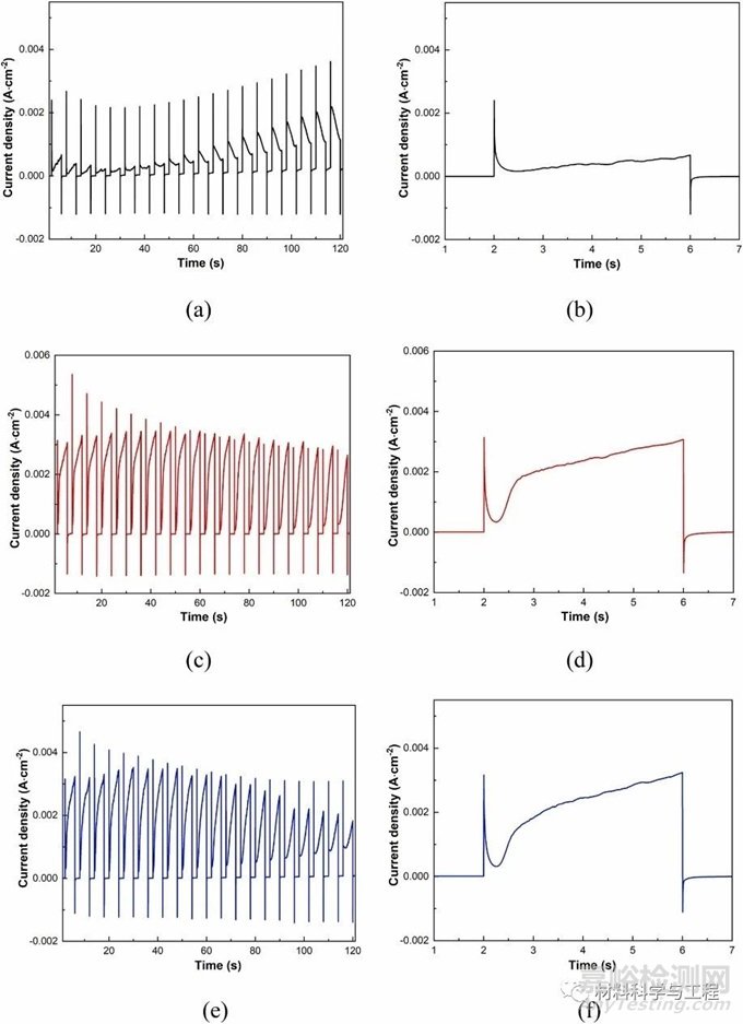 圖 3.循環(huán)恒電位脈沖:(a)和(b)KCl溶液;(c)和(d) KBr 溶液;(e)和(f) KCl + KBr 溶液。