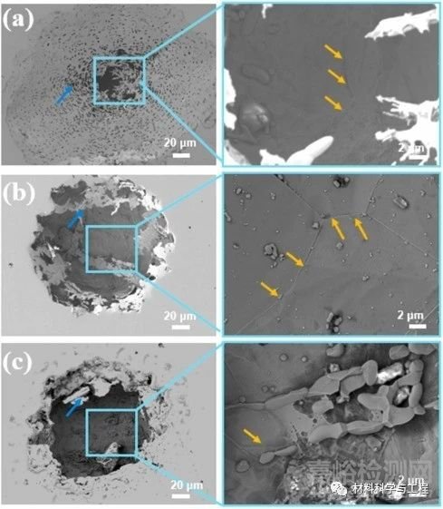圖 4.PPT試驗(yàn)后試樣表面點(diǎn)蝕形貌:(a)KCl溶液;(b) KBr溶液;(c) KCl + KBr混合溶液。