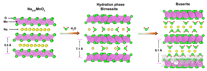 綜上所述,層狀鈉離子氧化物在潮濕空氣中會發(fā)生下述結(jié)構(gòu)和化學(xué)轉(zhuǎn)變過程: