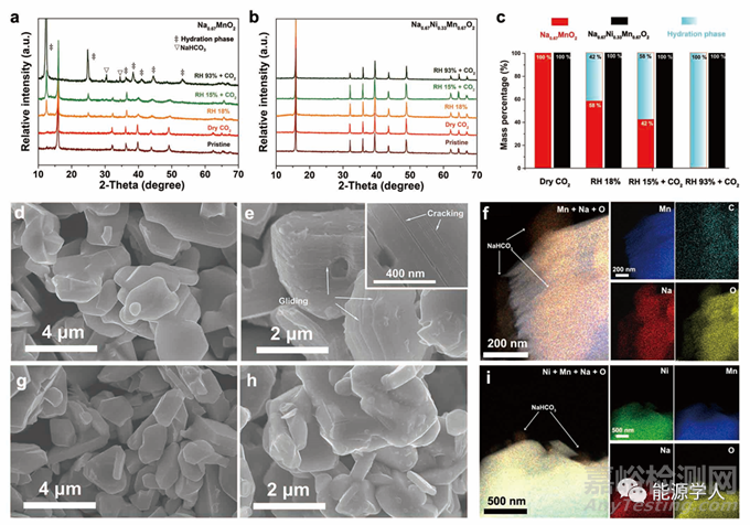 在這一部分,選擇錳酸鈉和鎳錳酸鈉分別作為潮濕空氣下不穩(wěn)定和穩(wěn)定的氧化物模板,將它們在干燥二氧化碳、相對濕度(RH)為18%無二氧化碳環(huán)境、RH15% + CO2 (存在二氧化碳)以及RH93% + CO2環(huán)境中放置三天。如圖2a-c所示,鎳錳酸鈉在這四種不同環(huán)境下無明顯的結(jié)構(gòu)變化。而錳酸鈉材料在潮濕環(huán)境下會生成碳酸氫鈉和水合相,水合相的比例隨著濕度的增加和二氧化碳的出現(xiàn)逐漸增加。在RH 93% +CO2的極端環(huán)境下,錳酸鈉材料完全水合。