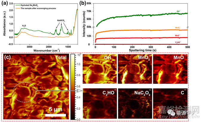 在測試TOF-SIMS之前,除去了材料表面的碳酸鹽(圖3a)。TOF-SIMS的深度分析(depth-profiles,圖3b)表明,碳物種的強度(165 a.u.)只有OH-強度(65k a.u.)的2.5‰。每摩爾水合錳酸鈉中的水分子濃度為~ 0.45 mol,證明水合相中無二氧化碳或者碳酸根的嵌入。圖3c化學(xué)成像(chemical mapping)表明,碳主要集中在材料的表面而非體相。上述結(jié)果表明,二氧化碳不會嵌入到氧化物的體相,其作用為與吸附在顆粒表面的水生成碳酸,從而進一步促進Na+-H+交換過程的發(fā)生。