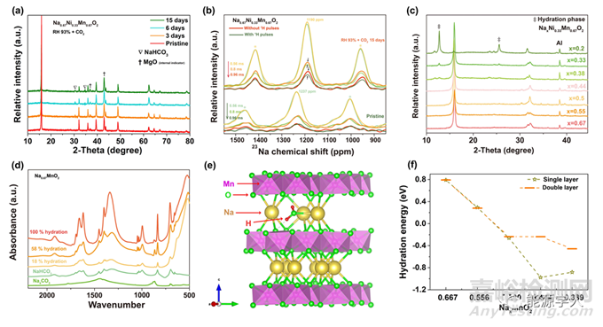 圖4. a)鎳錳酸鈉在潮濕環(huán)境中放置不同時間的XRD變化。b)鎳錳酸鈉在RH 93%+ CO2環(huán)境下放置15天后的23Na{1H} REDOR圖譜。c)不同鈉含量的鎳錳酸鈉極片在潮濕環(huán)境中放置三天后的XRD變化.d)在潮濕環(huán)境中暴露后形成的不同水合程度錳酸鈉的紅外光譜。e)DFT計算的單層脫出模型示意圖。f)基于單層和雙層模型的DFT計算結(jié)果。