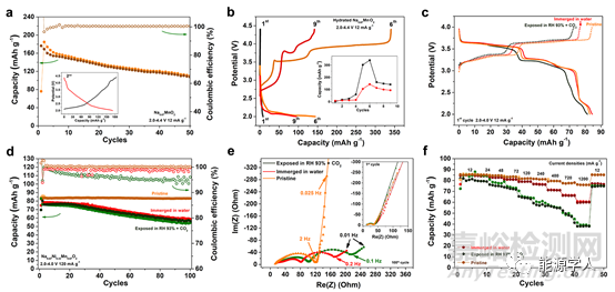 圖5. a)原始錳酸鈉和b)水合錳酸鈉的電化學(xué)性能。c-f)原始鎳錳酸鈉、水中浸泡后的鎳錳酸鈉以及潮濕空氣暴露的鎳錳酸鈉的電化學(xué)性能以及阻抗譜對比。