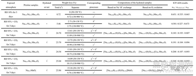 總而言之,對潮濕空氣中暴露的層狀鈉離子氧化物進行煅燒會發(fā)生下述化學(xué)以及結(jié)構(gòu)變化過程。根據(jù)這些過程可以給出準(zhǔn)確的水合相的化學(xué)計量比(結(jié)果展示在表1中,具體分析請閱覽原文)。
