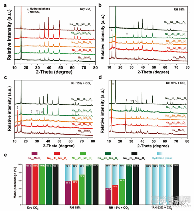 圖6. a-d) 五種層狀氧化物在不同氣氛下放置三天的XRD圖譜。e)根據(jù)XRD圖譜進行兩相精修得到的水合相比例。