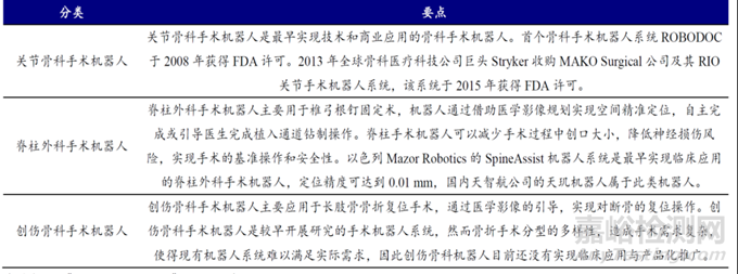 按照手術(shù)類型,骨科手術(shù)機(jī)器人可分為關(guān)節(jié)骨科手術(shù)機(jī)器人、脊柱外科手術(shù)機(jī)器人和創(chuàng)傷骨科手術(shù)機(jī)器人3大類。