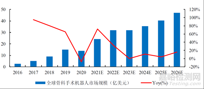 據(jù)Frost&Sullivan統(tǒng)計(jì),2020年全球關(guān)節(jié)置換手術(shù)機(jī)器人市場(chǎng)規(guī)模7.3億美元,美國(guó)是主要市場(chǎng)其規(guī)模達(dá)到5.3億美元,占全球份額的73%,預(yù)計(jì)2026年規(guī)模將達(dá)17.5億美元。我國(guó)2016年后才引進(jìn)關(guān)節(jié)置換手術(shù)機(jī)器人,市場(chǎng)規(guī)模相對(duì)較小,2020年市場(chǎng)規(guī)模為1480萬美元,僅有17臺(tái)關(guān)節(jié)置換手術(shù)機(jī)器人,預(yù)計(jì)2026年市場(chǎng)規(guī)模達(dá)到3.3億美元,關(guān)節(jié)置換手術(shù)機(jī)器人累計(jì)數(shù)量有望達(dá)近800臺(tái)。據(jù)Frost&Sullivan統(tǒng)計(jì),2020年美國(guó)市場(chǎng)使用關(guān)節(jié)置換手術(shù)機(jī)器人的手術(shù)數(shù)量約10萬例,滲透率為7.6%,預(yù)計(jì)2026年手術(shù)量增至40萬例,滲透率將達(dá)19.4%。相比之下,2020年國(guó)內(nèi)使用機(jī)器人輔助關(guān)節(jié)置換手術(shù)的數(shù)量?jī)H為243例,滲透率為0.03%,預(yù)計(jì)2026年手術(shù)量約8萬例,滲透率為3%,總體市場(chǎng)滲透率較低。