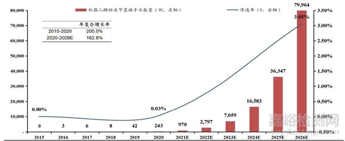 2015-2026E中國(guó)機(jī)器人輔助關(guān)節(jié)置換術(shù)例數(shù)及滲透率
