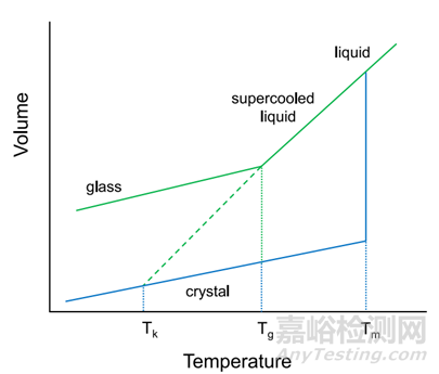 固體形式中除了晶體藥物,還有非晶體藥物性質(zhì),即無定形形式。對(duì)于無定形固體藥物來說,描述去物態(tài)變化的參數(shù)不再稱為熔點(diǎn),其具有兩種形態(tài),過冷液態(tài)和玻璃態(tài),二者之間的界限,稱之為玻璃化轉(zhuǎn)變溫度(圖1)。一般大于玻璃化轉(zhuǎn)變溫度,分子動(dòng)力學(xué)運(yùn)動(dòng)加劇,引起無定形的不穩(wěn)定,故而一般認(rèn)為無定形或者ASD的玻璃化轉(zhuǎn)變溫度越大越好,一般標(biāo)準(zhǔn)為75-80℃以上。